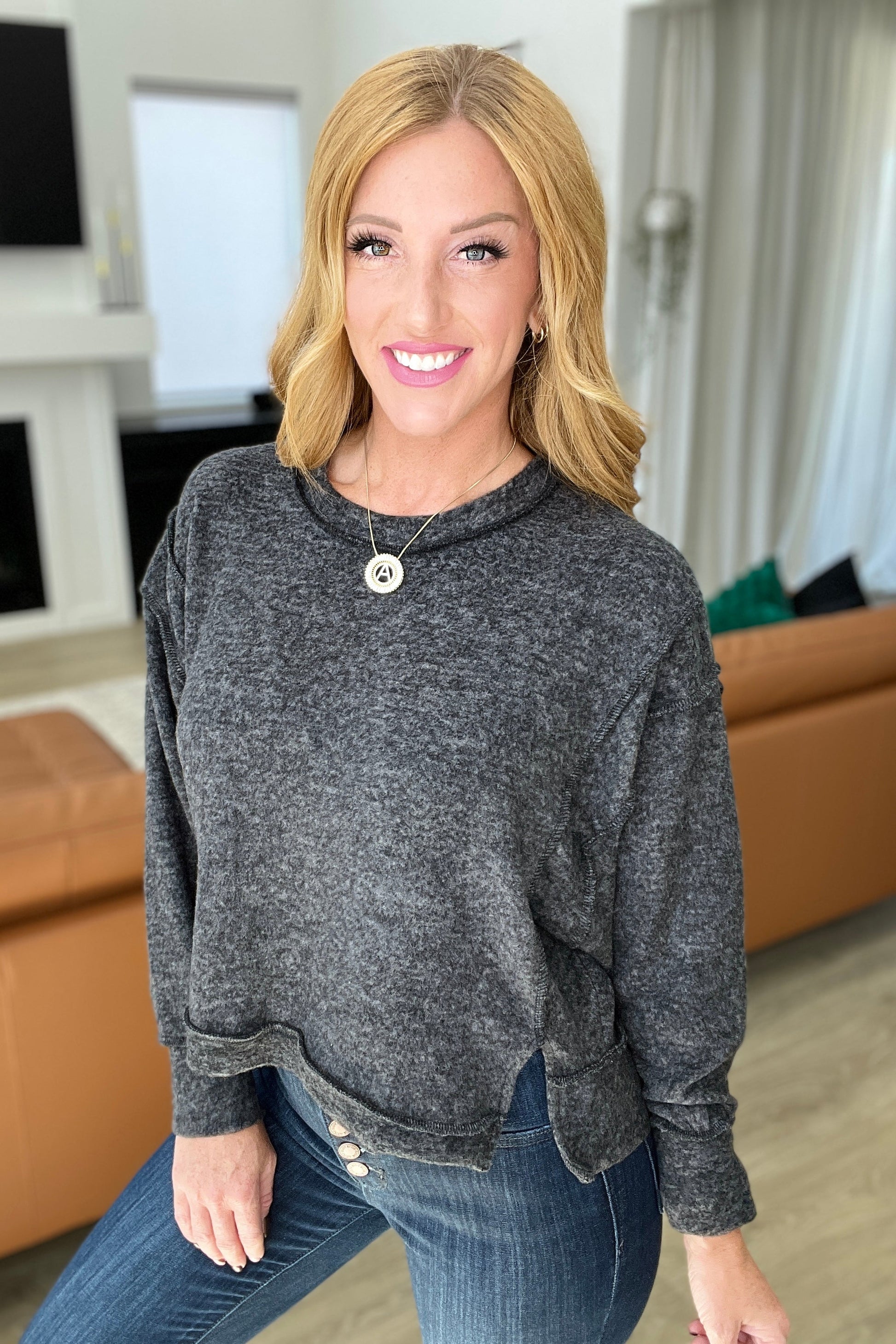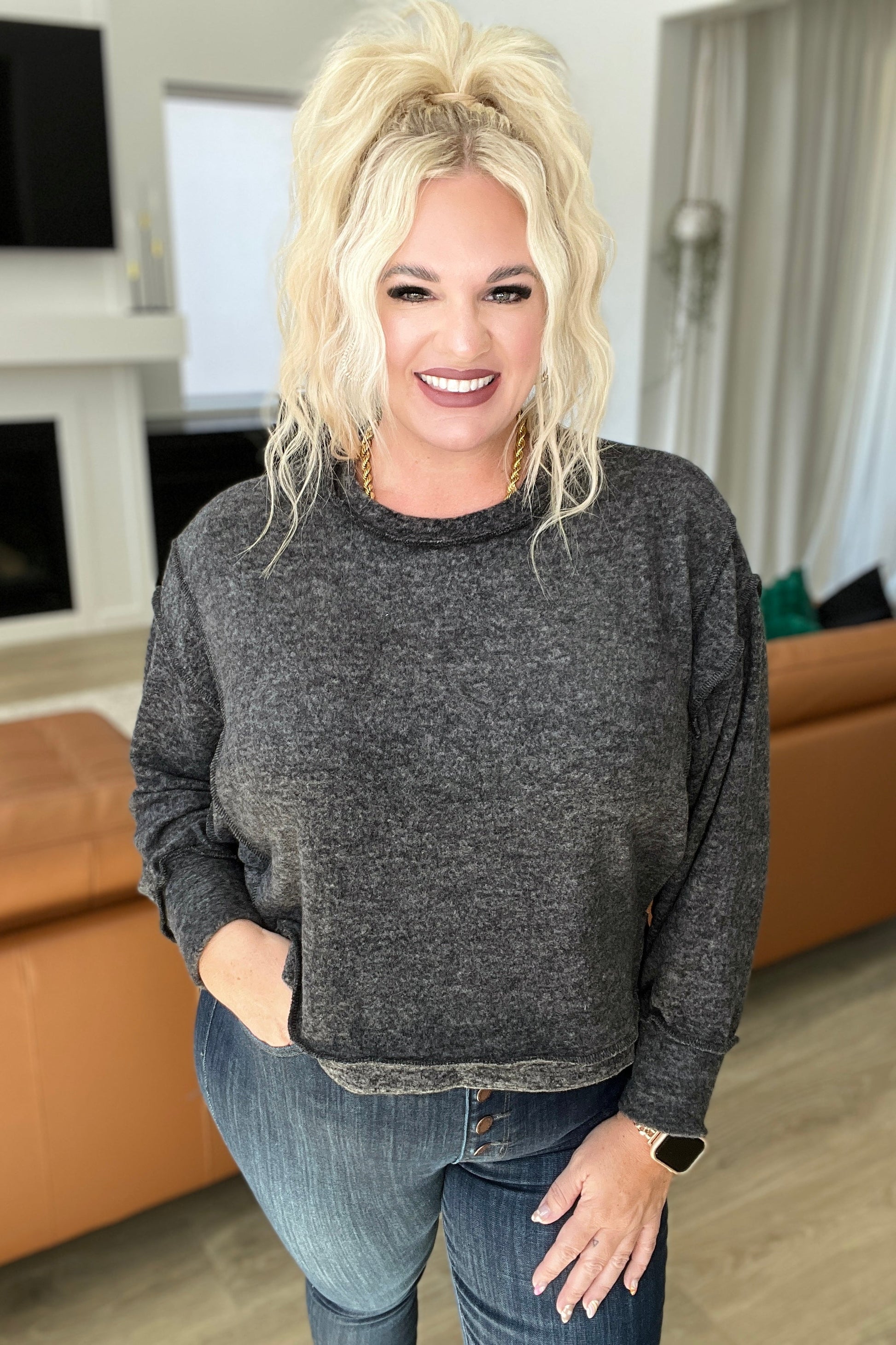 Stay cozy all season wearing the Brushed Hacci Oversized Sweater. Crafted from a soft brushed hacci knit, this piece features a stepped hem, dropped shoulders, and exposed seams for maximum comfort. With its cropped length, this sweater is perfect for pairing with high waisted bottoms for a chic, yet laid-back look.